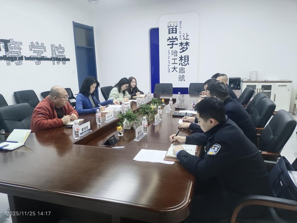 (董晓旭/文)为深化校警联动机制,精准对接涉外服务需求,助推学校国际化教育高质量发展,11月25日,哈尔滨市公安局出入境管理局局长赵洪伟一行到访我校国际教育学院开展交流,会议由国际教育学院院长赵异肖主持,国际教育学院相关人员参会。To deepen the campus-police collaboration mechanism, precisely addressforeign-related service demands, and boost the high-quality development of the university’s international education, on November 25, a delegation led by Zhao Hongwei, Director of the Exit-Entry Administration Bureau of Harbin Public Security Bureau, paid a visit tothe Collegeof International Education(CIE)of HIT.
