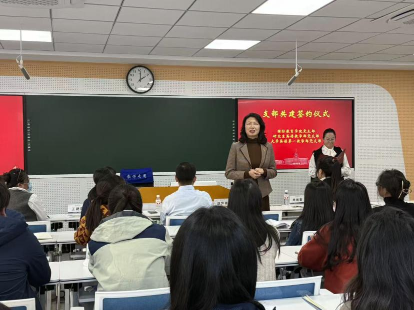 (孟晓利/文)为深入贯彻落实新时代党的建设总要求,推动党建与业务工作深度融合,11月13日,国际教育学院党支部与人文社科学部外国语学院研究生英语教学部党支部、大学英语第一教学部党支部举行共建签约仪式并联合开展主题党日活动。人文社科学部党委书记兼副主任周志国同志出席此次活动。To thoroughly implement the general requirements for Party building in the new era and promote the in-depth integration of Party building and variouswork, on November 13, the Party branch of the College of International Education, along with the Party branch of the Graduate English Teaching Department and the Party branch of the First College English Teaching D