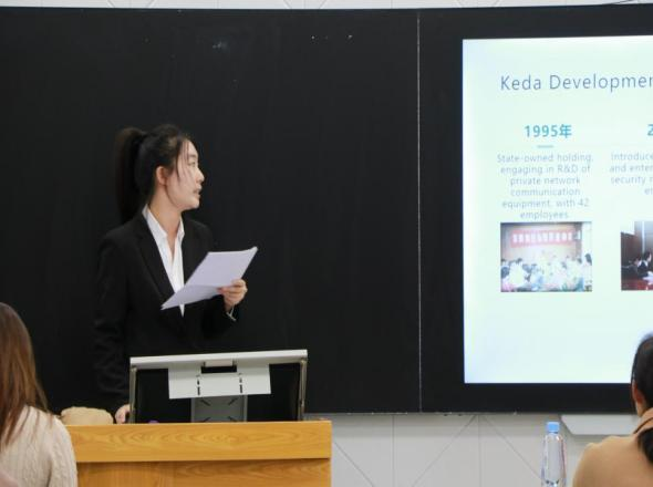 WANG Shuang, Corporate Representative of KEDACOM, delivering a presentation on the company's culture and competitive strengths