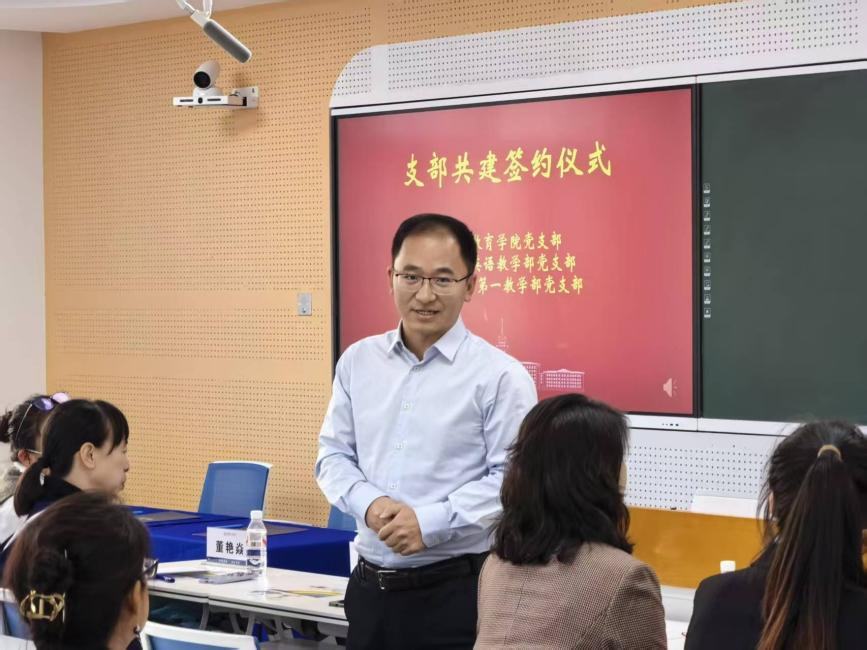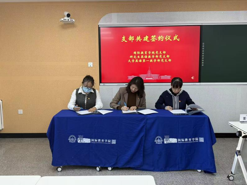 To thoroughly implement the general requirements for Party building in the new era and promote the in-depth integration of Party building and various work, on November 13, the Party branch of the College of International Education, along with the Party branch of the Graduate English Teaching Department and the Party branch of the First College English Teaching Department under the School of Foreign Languages of the Faculty of Humanities and Social Sciences, held a co-construction signing ceremony and launched a themed Party Day activity. Zhou Zhiguo, Secretary of the Party Committee and Deputy Director of the Faculty of Humanities and Social Sciences, attended the event.