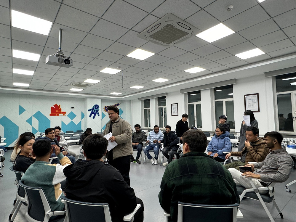 (宋恒/文)为助力2025级国际研究生快速适应在华学习生活、提升跨文化团队协作能力,10月14日晚,国际学生工作办公室于正心楼310教室举办国际研究生团队训练活动。本次活动吸引了来自泰国、柬埔寨、沙特阿拉伯、巴基斯坦等多个国家的30余名国际研究生参加,全体辅导员参与。活动伊始,辅导员卢静静向国际学生们致以热烈欢迎,强调团队协作与跨文化交流在学术研究和生活中的重要意义,鼓励大家在活动中积极展现文化特色、真诚交流。随后,在老师们的带领下,研究生新生们参与了丰富多彩的破冰游戏,让同学们迅速打破文化壁垒,真诚轻松地融入到跨文化交流和互动之中。通过“绘梦同心”、“心声彩绘”等环节,同学们抒发心声,共话梦想,在画纸上绘制属于自己的梦想的符号,最终拼成一幅多元共生的艺术作品。现场不时响起笑声与欢呼声,迅速拉近了不同国籍学生之间的距离,有效缓解了学业压力,也让大家在交流中找到成长目标。本次团队训练活动不仅丰富了国际研究生新生的课余生活,更助力他们在跨文化团队协作中提升能力、建立友谊,为后续的学术研究和在华生活奠定了坚实基础。国际教育学院Hi-Touch五洲之家心理辅导站将继续为国际学生打造更多富有特色