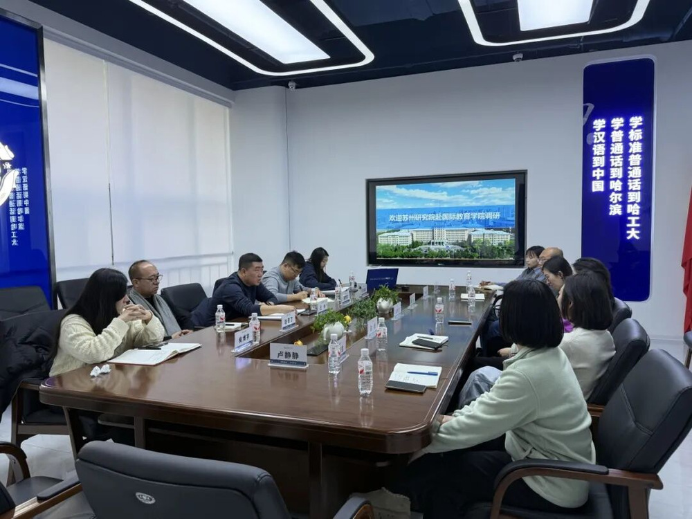 (王晏梓/文)2025年12月9日,哈尔滨工业大学苏州研究院副院长王林、长三角教育教学中心副主任赵亚丁一行到访我院,围绕国际教育合作与资源共享开展专题调研交流。国际教育学院院长赵异肖、副院长赵文、院务委员邵微、陈大庆及相关科室负责人参加本次座谈。On December 9, 2025, Wang Lin, Vice Dean of Harbin Institute of Technology (HIT) Suzhou Research Institute, and Zhao Yading, Deputy Director of the Yangtze River Delta Education and Teaching Center, paid a visit to the College of International Education of HIT to conduct in-depth research and exchanges focused on international education cooperation and resource sharing. Zhao