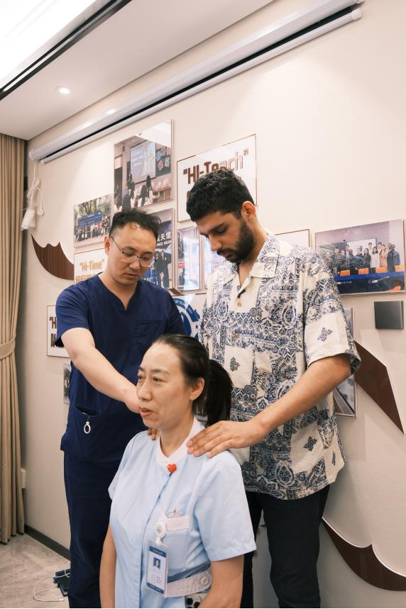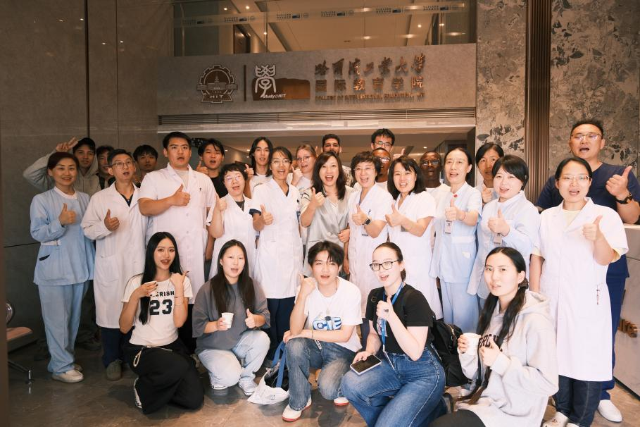 After the unveiling ceremony, medical staff from HIT Hospital held a Traditional Chinese Medicine (TCM) culture experience activity for international students. First, doctors from the hospital shared knowledge about TCM dietary therapy culture with the students and let them taste traditional TCM herbs such as wolfberries and dried tangerine peel. During the consultation session, doctors conducted TCM constitution identification for international students through face diagnosis, tongue diagnosis, and pulse diagnosis, put forward health preservation suggestions based on their symptoms, and advised students to go to bed early and get up early to develop good work and rest habits. Later, led by the doctors, international students experienced traditional TCM techniques such as acupuncture, massage therapy, cupping therapy, and auricular point pressing with beans. Participating students all said they were full of curiosity about TCM diagnosis and treatment methods and had experienced the magic and charm of TCM.