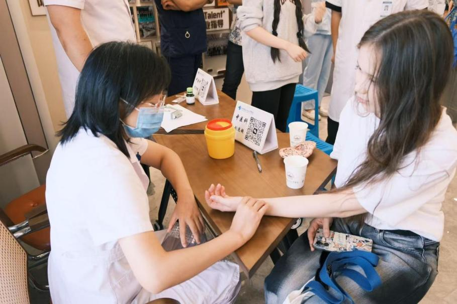 揭牌仪式后,校医院各位医护工作人员为国际学生开展了中医文化体验活动。首先,校医院的医生们向同学们分享了中医食疗文化知识,并让大家品鉴了枸杞、陈皮等传统中医药材。在面诊环节,医生们以面诊、舌诊、脉诊等方式为留学生们进行中医体质辨识,并根据相应症状提出相应的养生建议,嘱咐学生们早睡早起,养成良好的作息习惯。随后,在医生的带领下,留学生们先后体验了针灸、推拿按摩、拔罐、耳穴压豆等传统中医技法。参与学生纷纷表示对中医的诊治疗法充满好奇,也体会到中医的神奇和魅力之处。