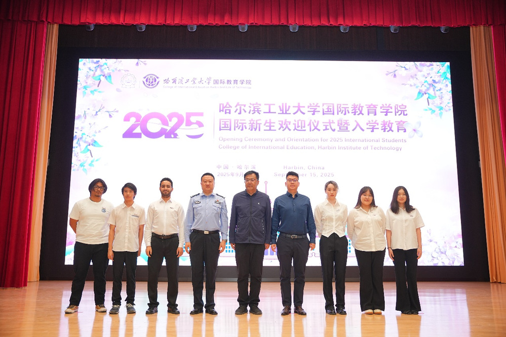 The autumn scenery is pleasant, and it is the perfect time to build dreams. On September 15th, the welcome ceremony and enrollment education for international freshmen of 2025 at the College of International Education (CIE) of Harbin Institute of Technology (HIT) was held in the auditorium of the main building. QU Fuzhong, Director of the Security Department; WANG Xiaodong, Deputy Section Chief of the Exit-Entry Administration Section of Nangang Branch of Harbin Public Security Bureau; ZHAO Yixiao, Dean of CIE; SU Andi, Assistant Dean of CIE; SHAO Wei and CHEN Daqing, Members of the College Affairs Committee; MU Zhanshuo, Teacher of the Security Department; heads of various departments of CIE, teacher representatives, and counselors jointly gave the first lesson of the new semester to the new students. The ceremony was hosted by counselor LI Yongqi.