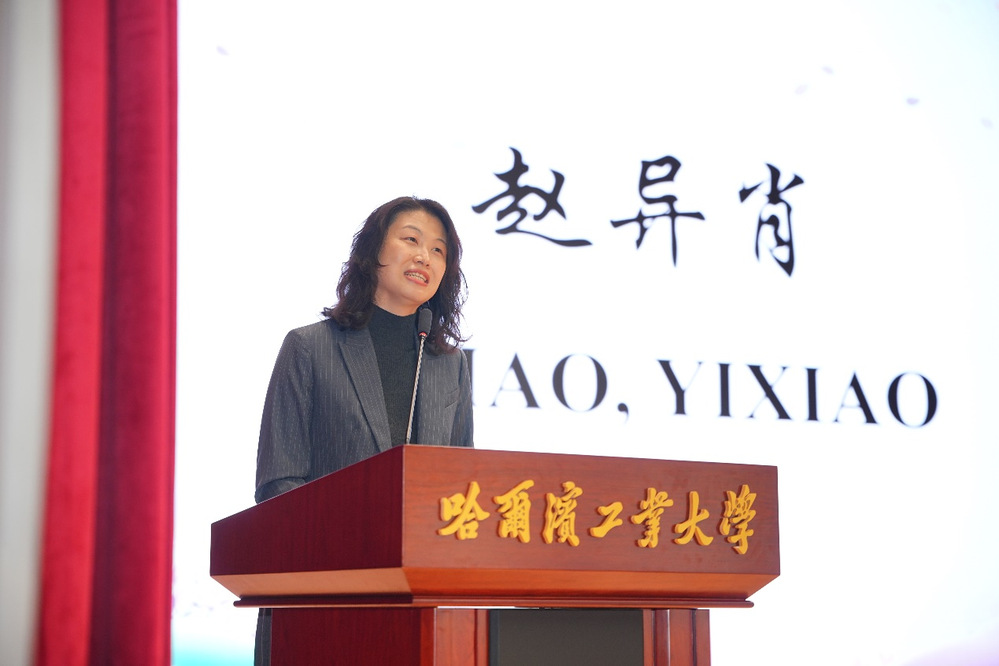 随后,国际教育学院院长赵异肖发表致辞。她代表学院全体师生对新生的到来表示热烈欢迎,通过引用阿拉伯谚语“求知去吧,哪怕远至中国”,肯定了新生们跨越山海追求知识的勇气,同时介绍了哈工大的办学实力、师资力量与科研平台。赵异肖寄语新生,要志存高远、勤学笃行,以严谨态度钻研专业知识;要包容互鉴、增进理解,在多元文化中搭建友谊桥梁;要遵规守纪、诚信为人,展现国际学生的良好风貌,鼓励大家在哈工大“埋下向上生长的种子”,书写属于自己的精彩篇章。