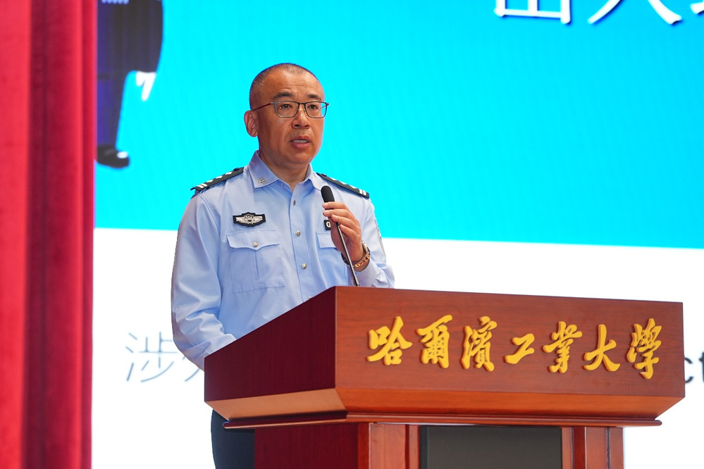 在随后的入学教育环节,哈尔滨市公安局南岗分局外管科警官钟震宇围绕国际学生在华法律法规展开宣讲,详细解读了签证办理、居留许可、合法权益与义务等关键内容,提醒新生们遵守中国法律,保障自身在华生活的合规与安全。哈尔滨工业大学保卫处教师母展硕则聚焦校园安全,从消防安全、人身安全、财产安全等方面进行讲解,结合校园实际案例,强调“安全无小事”,引导新生增强安全防范意识。