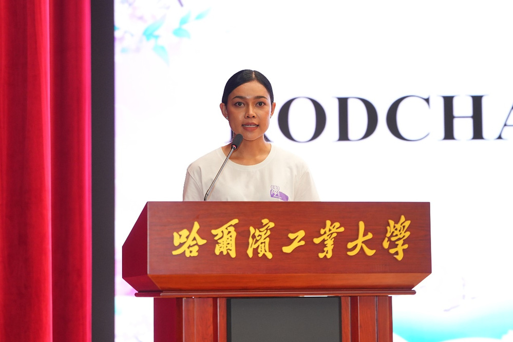 2025级硕士研究生泰国籍RODCHAROEN SAINAMPUENG谭海月作为新生代表发言。曾以汉语进修生身份走进哈工大的她,如今以工商管理专业研究生的新身份重返校园。她分享了自己在汉语学习中收获的“天道酬勤”等中国智慧,讲述了自己在哈尔滨的生活和学习感受。她表示,中泰友谊如两棵根系相连的大树,在哈工大的求学岁月中,她将扎根中文、深耕专业、汲取中国文化,让个人的梦想之树枝繁叶茂,为这片友谊森林再添新绿。
