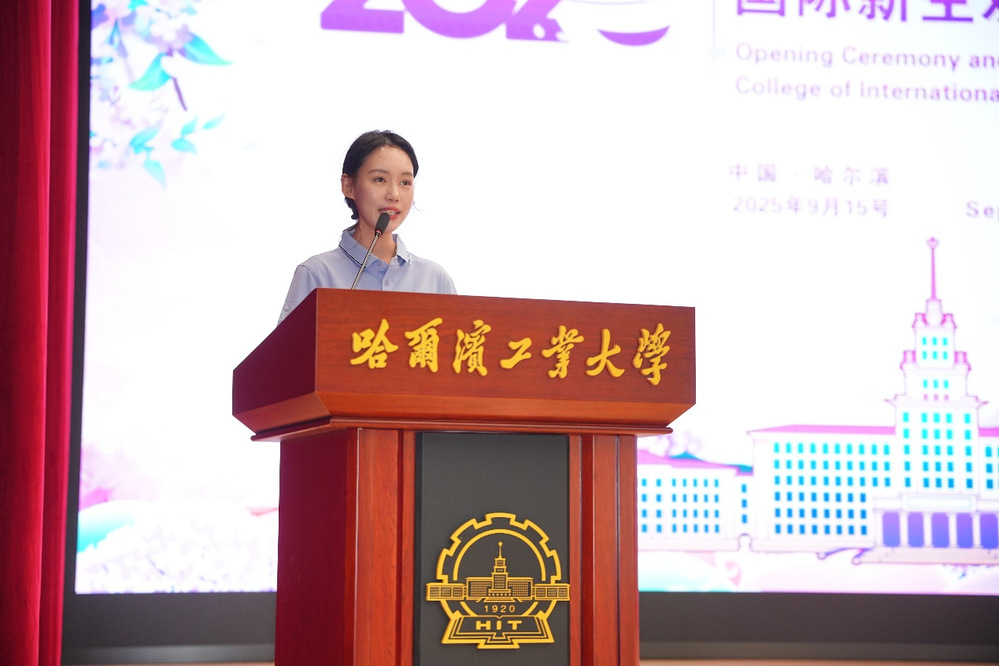 Subsequently, ZHAO Yixiao, Dean of CIE, delivered a speech. On behalf of all teachers and students of the college, she extended a warm welcome to the new students. By quoting the Arab proverb Seek knowledge, even if it is as far as China, she affirmed the new students’ courage to pursue knowledge across mountains and seas, and at the same time introduced HIT’s school-running strength, faculty, and scientific research platforms. ZHAO Yixiao advised the new students to aim high, study diligently and act with determination, and explore professional knowledge with a rigorous attitude; to be inclusive and learn from each other to enhance understanding, and build bridges of friendship in a multicultural environment; to abide by rules and disciplines, be honest, and show the good demeanor of international students. She encouraged everyone to plant the seeds of upward growth at HIT and write their own wonderful stories.