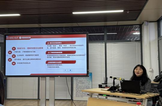 (孟晓利/文)为协同推进学校教育国际化进程,助力院系提升国际学生教学水平,2025年10月15日下午,国际教育学院组织培训团队赴体育部举办跨文化交流专题分享会。培训团队由来华培养部主任郑阳阳、来华项目部副主任甄臻、来华管理部副主任卢静静、发展规划部孟晓利组成。